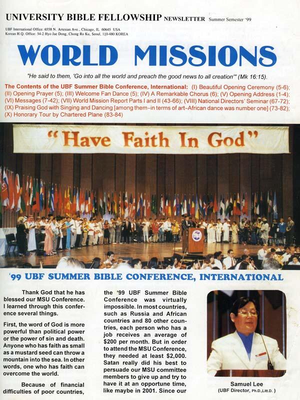 1. Весной 1999 года, М. Самуэль Ли принудительно прекратил издание корейского информационного журнала («World Missions», Newsletter), напрямую позвонив главному редактору, без договоренности п. Джоном Джаном (John Jun) [в то время: директор корейского UBF, сейчас: Генеральный Директор всего UBF]. Большинство из 1500 миссионеров в 87 странах, осуществляют свою миссию не в англо-говорящих странах. Они хотят быть в курсе новостей корейского UBF, и они нуждаются в информационном издании на корейском языке, которое дает миссионерам большую поддержку и силу. Многие миссионеры, не владея английским языком, не читают информационное издание UBF на английском языке [которое редактируется в Чикагском UBF Самуэлем Ли]. Кроме того, информационное издание корейского UBF также хотят читать братья и сестры корейских отделений UBF. Поэтому мы считаем, что данное информационное издание UBF на корейском языке необходимо снова опубликовать так быстро, насколько это возможно. М. Самуэль Ли! Каково Ваше мнение?